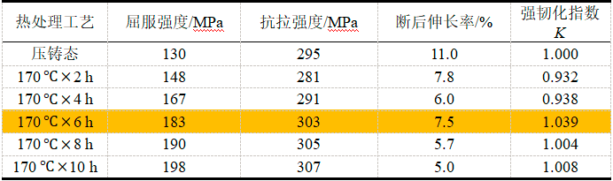 In the formula, is the measured mechanical properties of the alloy after different heat treatment systems; is the average value of the mechanical properties of the alloy in the die-cast state. Table 3 shows the mechanical properties and toughening index of AlSi7CuMnMg alloy in the die-cast state and at different aging temperatures for 6 h. From Table 3, it can be seen that the K value of the No. 3 sample is the largest, which is 1.039, indicating that the No. 3 sample has the highest toughening index K value. Has the best comprehensive mechanical properties.