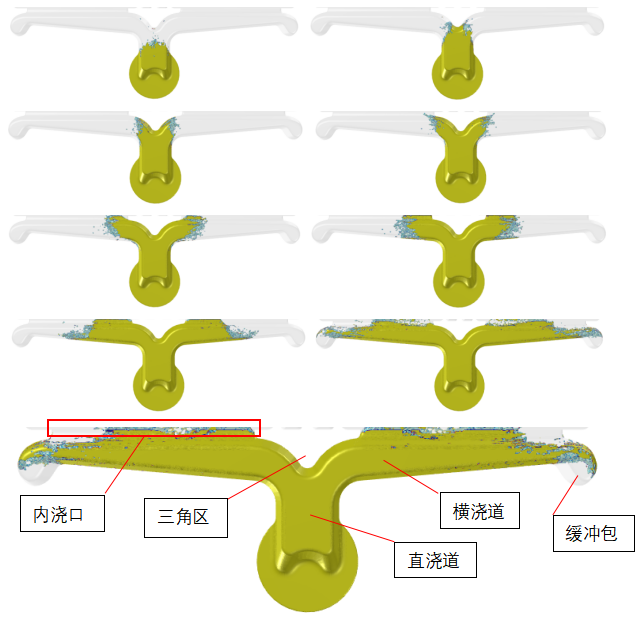 It can be seen from the filling process shown in Figure 1 that the molten metal always gradually reaches the inner gate in a state of being filled with the runner, and will not form a roll in the runner, and the molten metal at the forefront also flows into the buffer package, which is effective Avoid cold and dirty metal from entering the cavity.