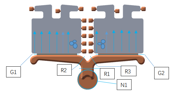 And, from the sprue to the inner gate, the cross-sectional area is gradually reduced, as shown in Figure 2, N1>R1>(R2+R3)>(G1+G2), and N1≈1.25~1.7(G1 +G2).