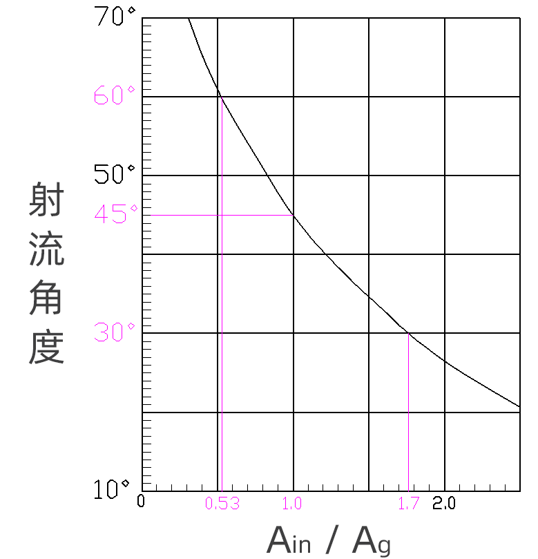 Combining Figure 4: Jet angle-cross-runner cross-sectional area/in gate relationship diagram, the specific jet angle value can be determined to be 45°.
